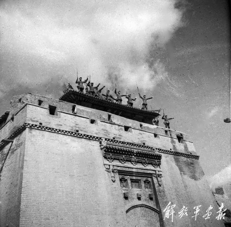 1945年11月,八路軍在河北省蔚縣城樓上勝利歡呼。(攝影/孟振江)