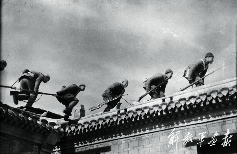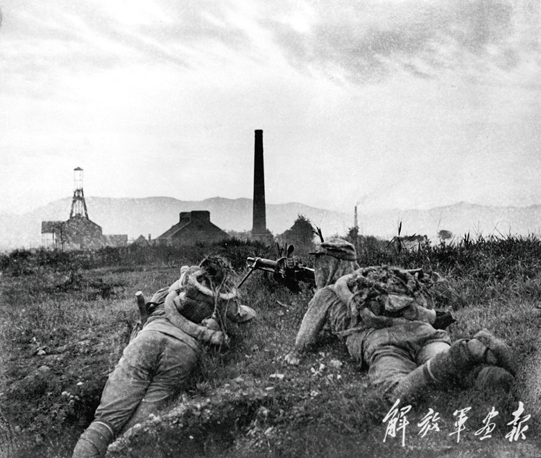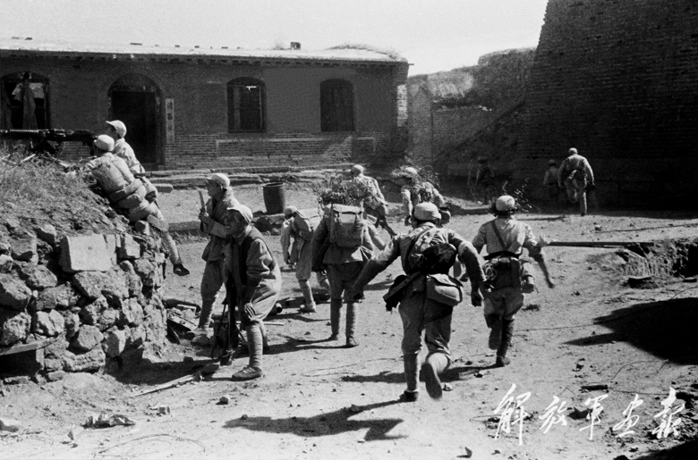 1948年,東北野戰(zhàn)軍發(fā)起遼沈戰(zhàn)役。圖為解放軍在重機槍的掩護(hù)下,在義縣城內(nèi)與國民黨軍隊進(jìn)行巷戰(zhàn)。(攝影/齊觀山)