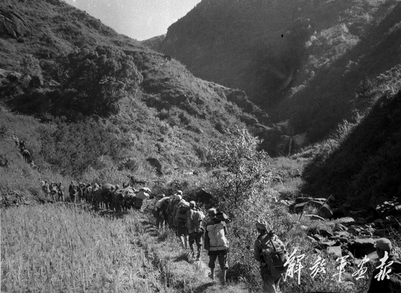 1947年8月,劉鄧大軍行進(jìn)在大別山北麓山區(qū)。(攝影/裴 植)