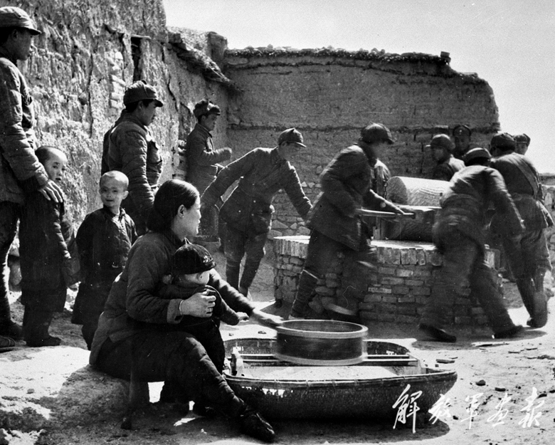 1945年冬,八路軍戰(zhàn)士幫助老鄉(xiāng)推碾子磨面。(攝影/梁明雙)