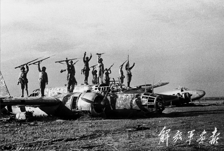 1947年,東北民主聯(lián)軍在夏季攻勢中發(fā)起四平攻堅戰(zhàn)。圖為6月12日,攻克四平機場后,我軍戰(zhàn)士站在被擊毀的敵機上歡呼。(攝影/齊觀山)