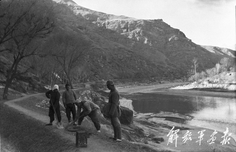 晉察冀邊區(qū)民兵在敵人將要經(jīng)過(guò)的河灘上埋地雷。(攝影/石少華 本刊資料室提供)