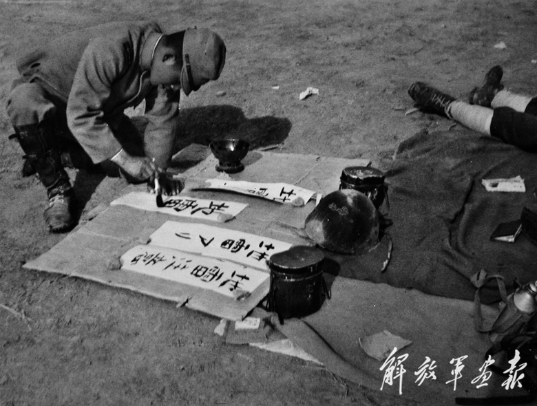 這是我軍繳獲日軍拍攝的照片,圖為一名日軍在書(shū)寫(xiě)“注意地雷”的標(biāo)語(yǔ)。(本刊資料室提供)