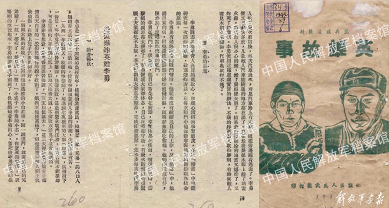 1944年華北軍區(qū)編印的《英雄故事》封面及李勇事跡內(nèi)頁(yè)。(中國(guó)人民解放軍檔案館提供)