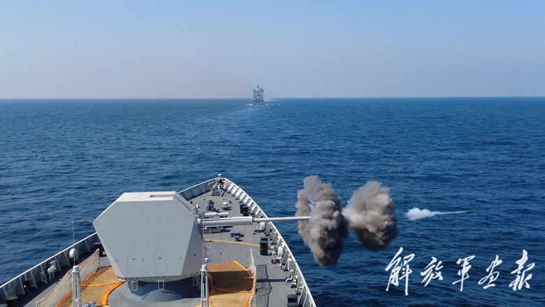 中國海軍包頭艦進(jìn)行主炮射擊訓(xùn)練。