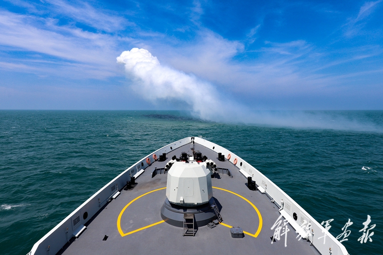 “開(kāi)火!”邯鄲艦鎖定目標(biāo)后,立即對(duì)“敵艦”發(fā)起攻擊。霎時(shí)間,海面炮聲隆隆,硝煙彌漫。