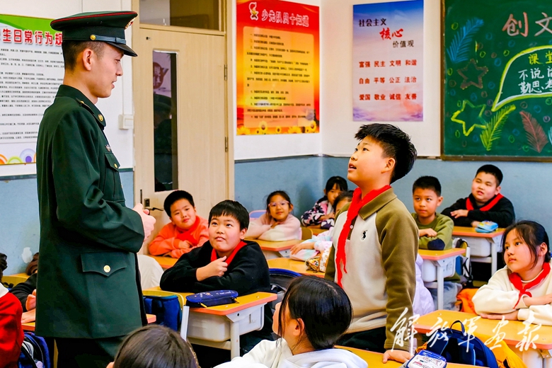 3月2日,陸軍第82集團軍某旅開展“崗位學(xué)雷鋒、攻堅當(dāng)先鋒”教育實踐活動。圖為該旅戰(zhàn)士耿露在駐地小學(xué)宣講雷鋒事跡時與小學(xué)生互動。(攝影/王仕亞)