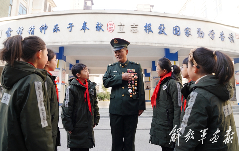 近日,陸軍某團二級軍士長尹凡根(中)利用探親休假時機,走進(jìn)家鄉(xiāng)小學(xué),為小學(xué)生講述自己立足崗位學(xué)雷鋒的故事。(攝影/特約通訊員 袁 凱)