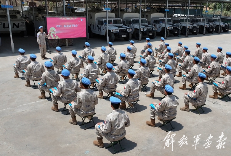 中國(guó)第11批赴南蘇丹(朱巴)維和步兵營(yíng)組織官兵學(xué)習(xí)兩會(huì)精神。(攝影/王昆博)
