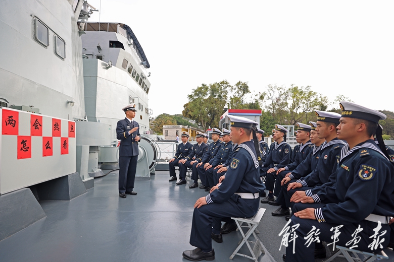 海軍某登陸艦大隊(duì)開(kāi)展“兩會(huì)熱點(diǎn)怎么看”討論活動(dòng)。(攝影/王文斌)