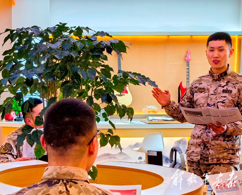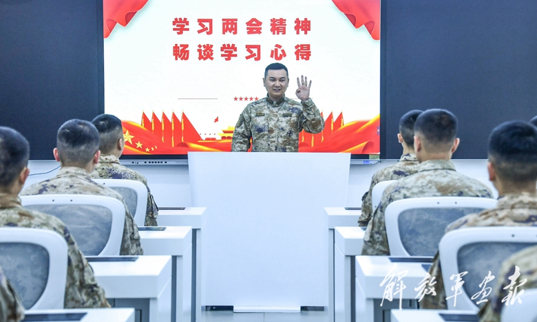 陸軍第73集團(tuán)軍某旅官兵開(kāi)展學(xué)習(xí)兩會(huì)精神活動(dòng),分享交流學(xué)習(xí)心得。(攝影/特約通訊員 劉志勇)