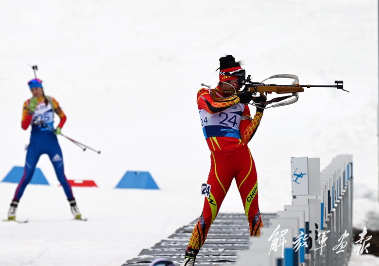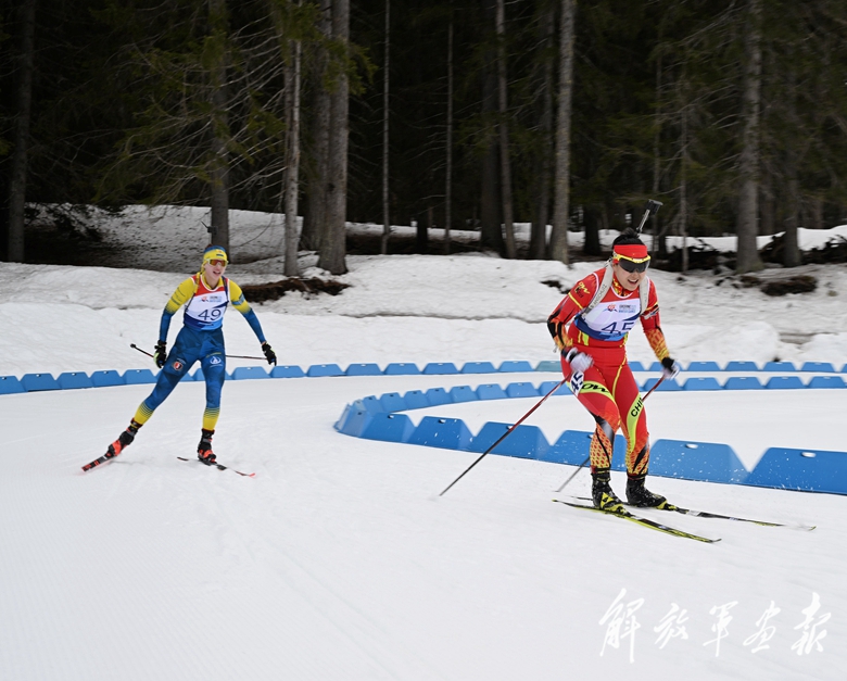 當?shù)貢r間3月25日,我軍選手曲穎(右)參加冬季兩項比賽。