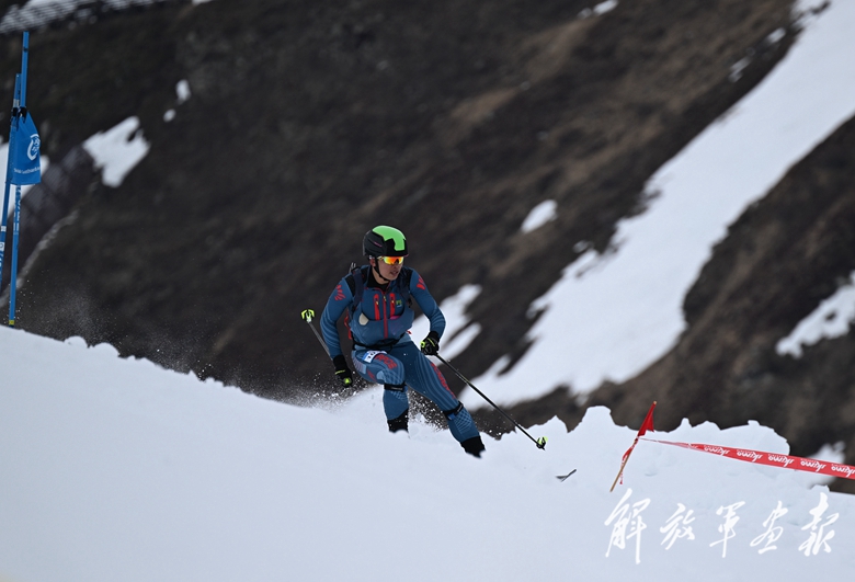 當?shù)貢r間3月28日,我軍選手朱磊在滑雪登山混合接力比賽中。