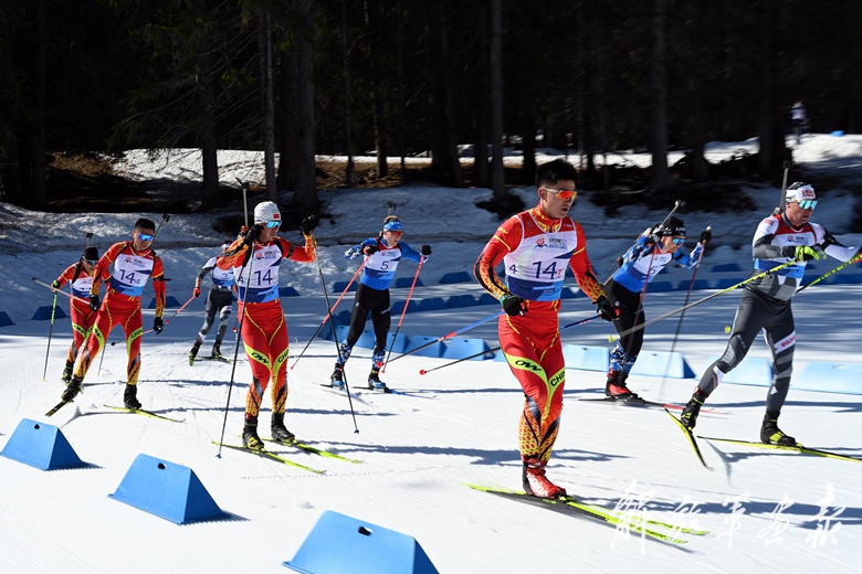 當?shù)貢r間3月28日,我軍選手進行男子雪地巡邏比賽。
