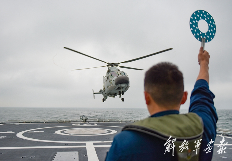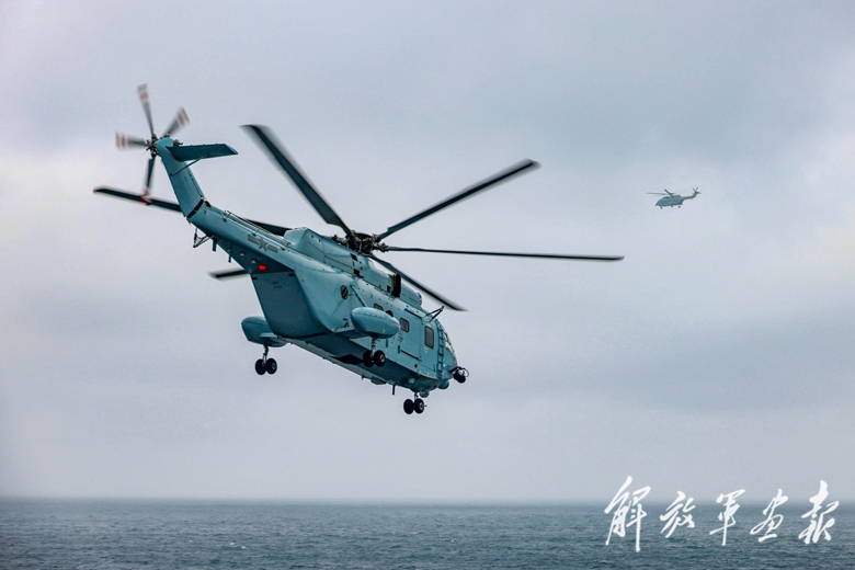 中方參訓(xùn)艦艇祁連山艦艦載直升機(jī)飛向預(yù)定空域。(攝影/特約通訊員 喬晨曦)