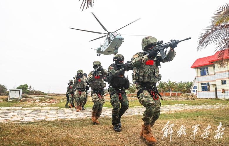 中泰雙方參訓(xùn)隊(duì)員從直升機(jī)滑降后,成戰(zhàn)斗隊(duì)形向目標(biāo)區(qū)域進(jìn)行滲透。(攝影/高國敬)