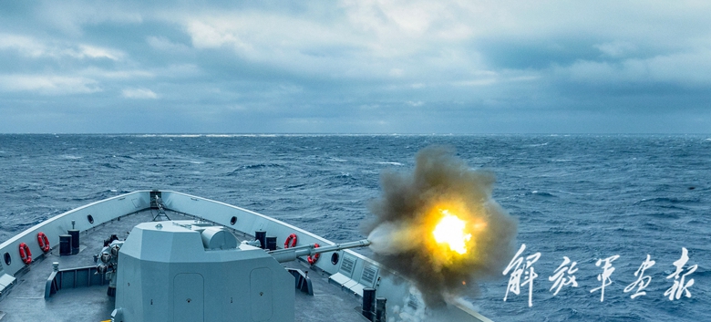 聯(lián)合對(duì)海打擊課目中,中方參訓(xùn)艦艇許昌艦進(jìn)行主炮射擊。(攝影/賈曉鵬)