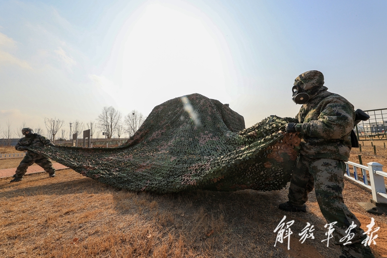 官兵在全防護狀態(tài)下對車輛進行偽裝。