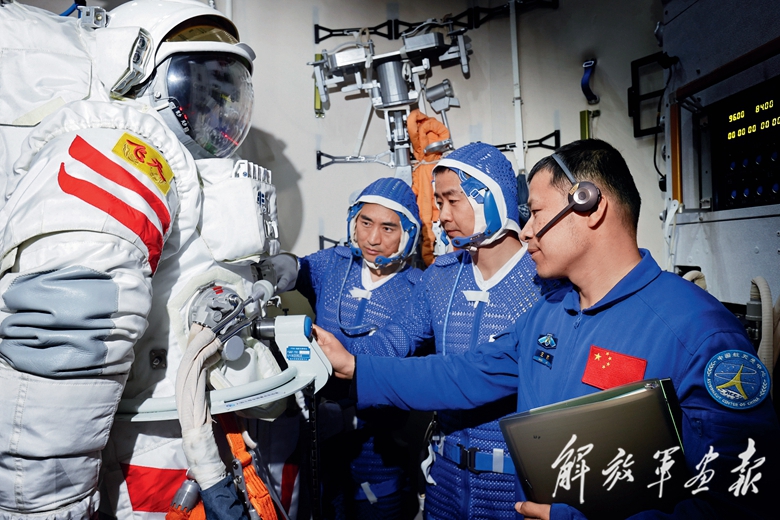 神舟二十號航天員乘組(從左至右:陳中瑞、陳冬、王杰)進行出艙程序訓(xùn)練。(攝影/徐 部)