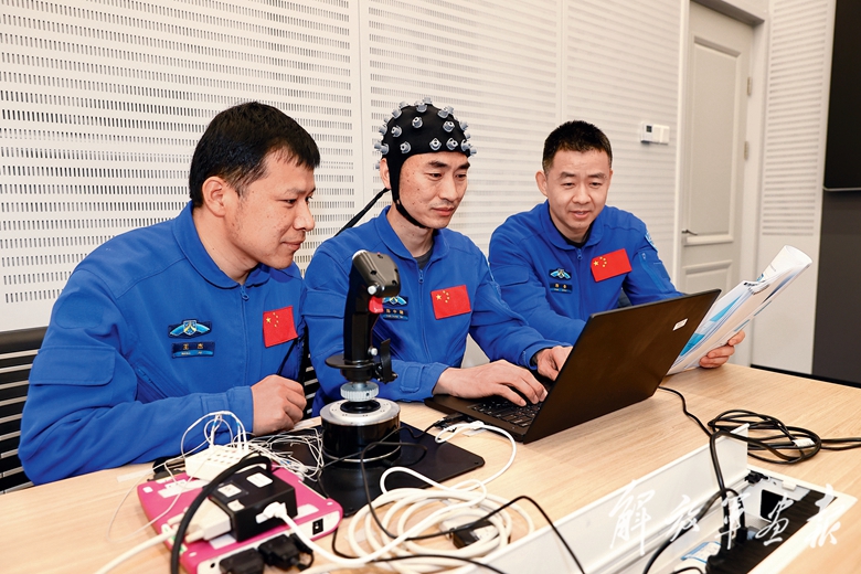 神舟二十號航天員乘組(從左至右:陳中瑞、陳冬、王杰)在進行飛船程序訓(xùn)練。(攝影/徐 部)