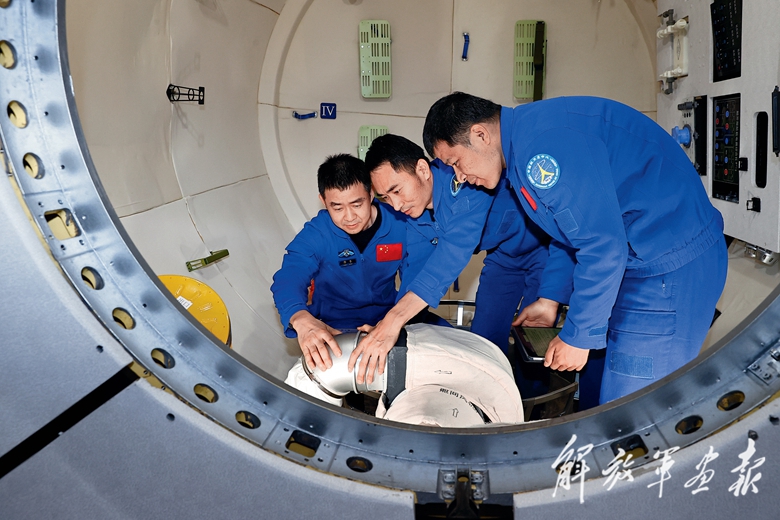 神舟二十號航天員乘組(從前至后:陳冬、王杰、陳中瑞)進行在軌實驗操作訓(xùn)練。(攝影/徐 部)