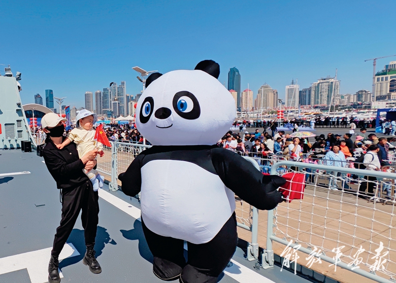 青島奧帆中心碼頭,成都艦、臨沂艦懸掛滿旗靠泊開放,幾只憨態(tài)可掬的大熊貓玩偶帶著“第二故鄉(xiāng)”的問候“現(xiàn)身”,吸引參觀者拍照留念。