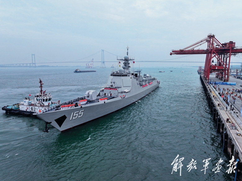 4月21日,南京艦、六安艦首次回到人民海軍誕生地江蘇省泰州市。圖為南京艦在泰州國(guó)際集裝箱碼頭靠港。(攝影/張?zhí)镆埃?/span>