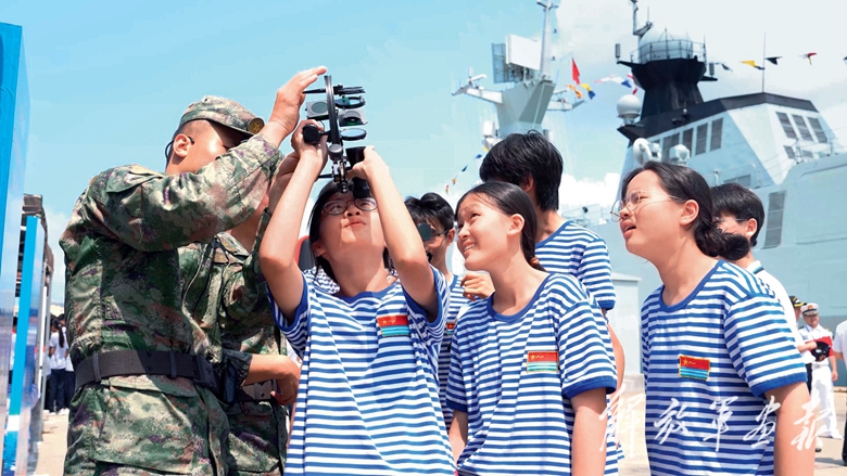 4月23日,南部戰(zhàn)區(qū)海軍某基地開展“城艦共建”活動(dòng)。圖為當(dāng)?shù)匦W(xué)生體驗(yàn)使用航海儀器。(攝影/黃嘉誠(chéng))
