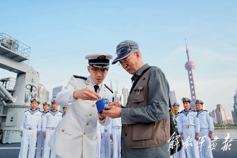 4月22日,上海舉行艦艇開放活動(dòng),老一代沂蒙山艦見習(xí)機(jī)電長(zhǎng)、91歲的退役老兵鄧石(前右)登上現(xiàn)役沂蒙山艦,與艦員交流。(攝影/孫 ?。?/span>