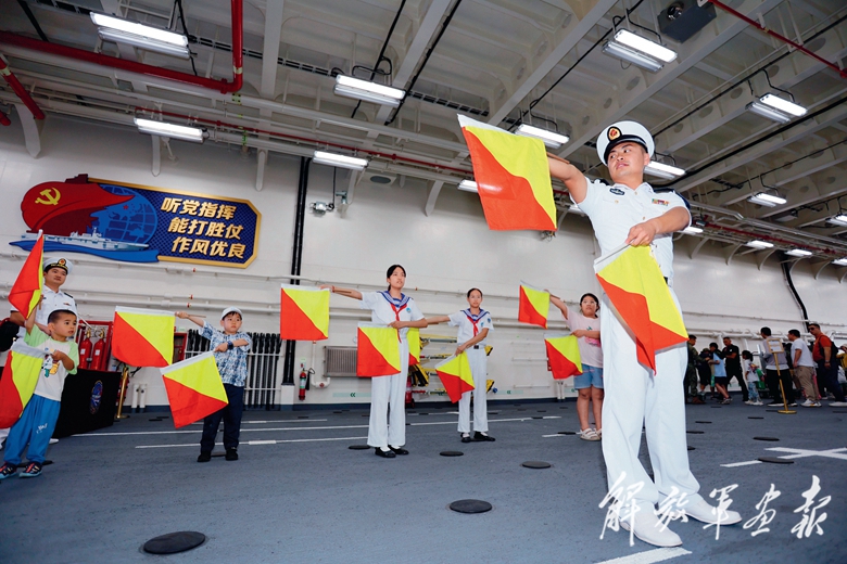 4月26日,海南艦開放期間,參觀者體驗(yàn)海軍手旗通信。(攝影/王文斌)