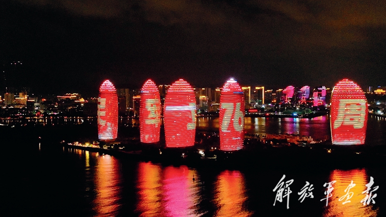 4月21日,海南省三亞市通過城市燈光秀、樓宇電子屏等,播放人民海軍系列宣傳片和海報(bào)。(攝影/馮孟龍)