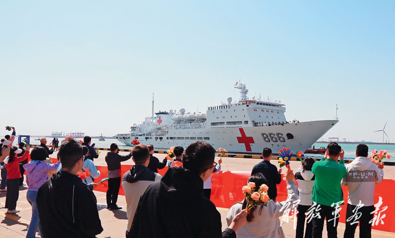 4月25日,天津國(guó)際郵輪母港碼頭,海軍“和平方舟”號(hào)醫(yī)院船圓滿結(jié)束“回家之旅”,官兵與前來送別的群眾揮手告別。(攝影/史 冰)