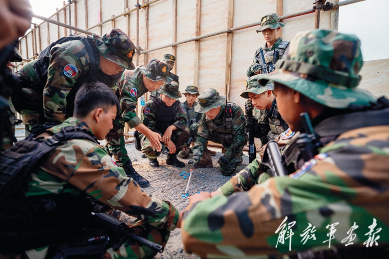 5月28日,柬埔寨磅清揚省,陸空方向?qū)嵄鴮崗椦菥氃谕跫臆姂棻?xùn)練中心舉行。演練以“恐怖分子”襲擊某中柬合資企業(yè),挾持多名“人質(zhì)”,并依托周邊建筑群進行抵抗為背景,突出城市反恐,聚焦解救人質(zhì)和圍殲清剿等重點內(nèi)容。中柬參演兵力統(tǒng)一編成聯(lián)合任務(wù)部隊,區(qū)分聯(lián)合封控、突擊營救、追逃捕殲、全局布控等階段,組織實施多維偵察、立體突擊、營救人質(zhì)、肅清殘敵等24項戰(zhàn)術(shù)行動。