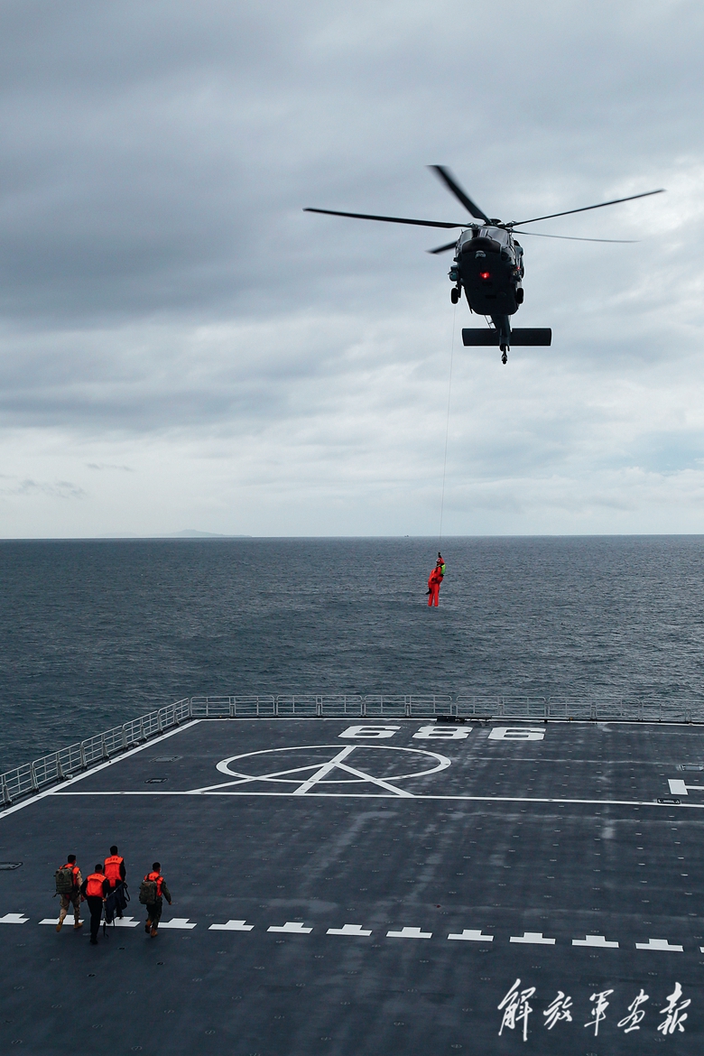 5月26日,??辗较?qū)嵄菥氈?,參演直升機將“傷員”轉(zhuǎn)運至中國海軍長白山艦。