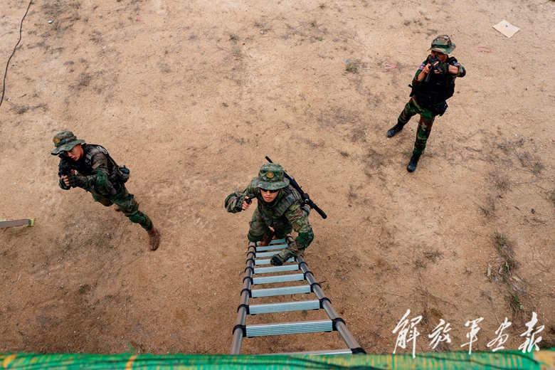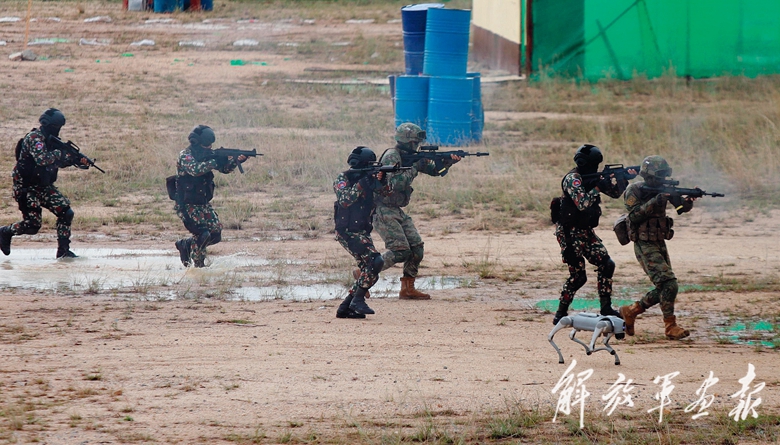 5月28日,陸空方向?qū)嵄鴮崗椦萘?xí)中,中柬聯(lián)合任務(wù)部隊在機器狗配合下向“恐怖分子”藏身處接近,準備解救“人質(zhì)”。