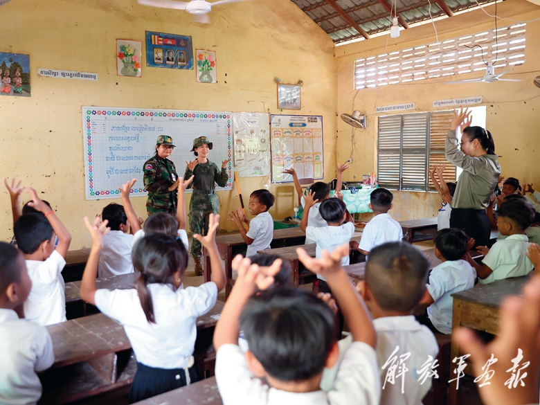 5月19日,中方參演官兵代表走進磅清揚省丹克茂學(xué)校教室,與學(xué)生互動交流。