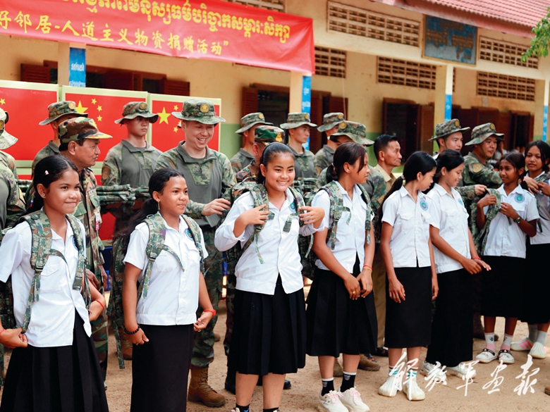 5月19日,中方參演官兵代表向磅清揚省丹克茂學(xué)校學(xué)生贈送學(xué)習(xí)用品。