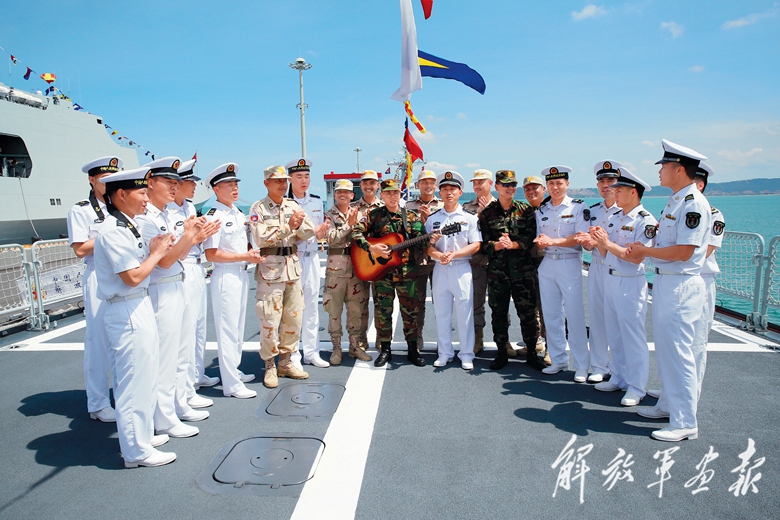 5月18日,中方艦艇舉行開放日活動,雙方官兵在飛行甲板上共同演唱歌曲。
