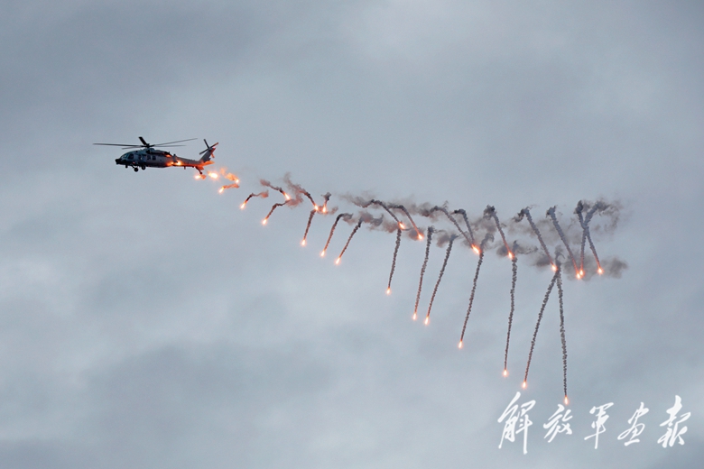 5月26日,??辗较?qū)嵄?xùn)練中,中方空軍直升機發(fā)射熱誘彈。