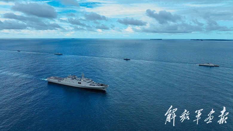 5月26日,??辗较?qū)嵄菥氃谖鞴烁鄹浇S蚺e行。圖為參演的中柬聯(lián)合任務(wù)編隊向目標海域機動。
