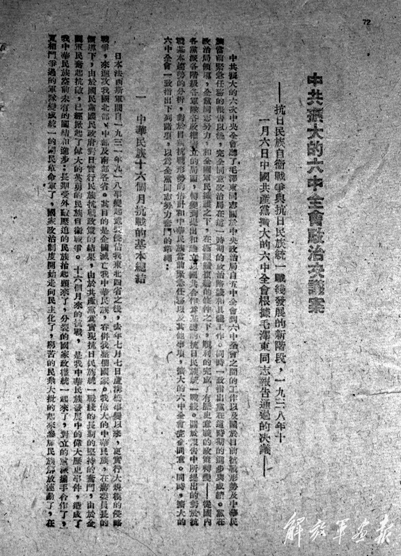 毛澤東同志在六屆六中全會(huì)上作了《論新階段》的政治報(bào)告和《統(tǒng)一戰(zhàn)線中的獨(dú)立自主問題》《戰(zhàn)爭(zhēng)和戰(zhàn)略問題》的結(jié)論。這是全會(huì)根據(jù)毛澤東同志的報(bào)告通過的政治決議案。