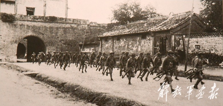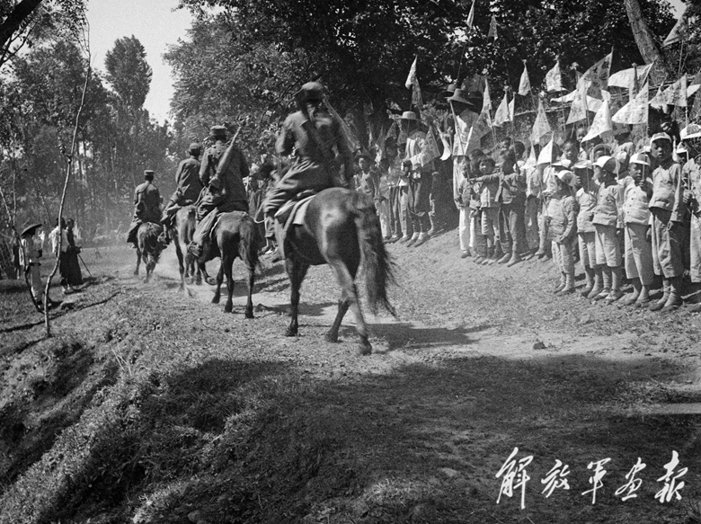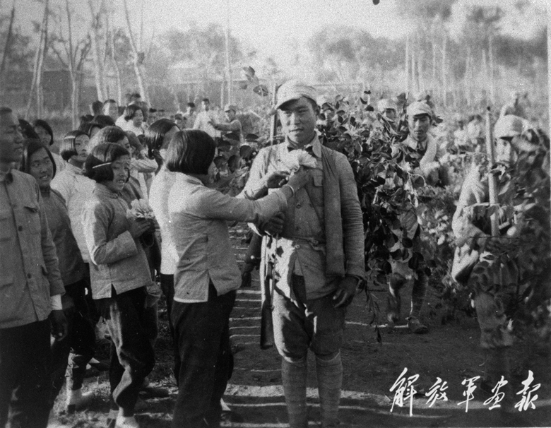 群眾熱烈歡迎參加大龍華殲滅戰(zhàn)的勇士們凱旋。