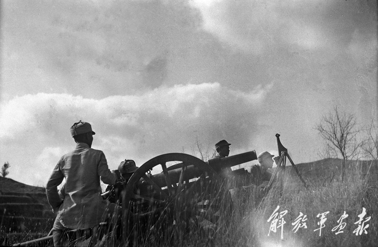 八路軍第120師官兵炮擊敵碉堡。