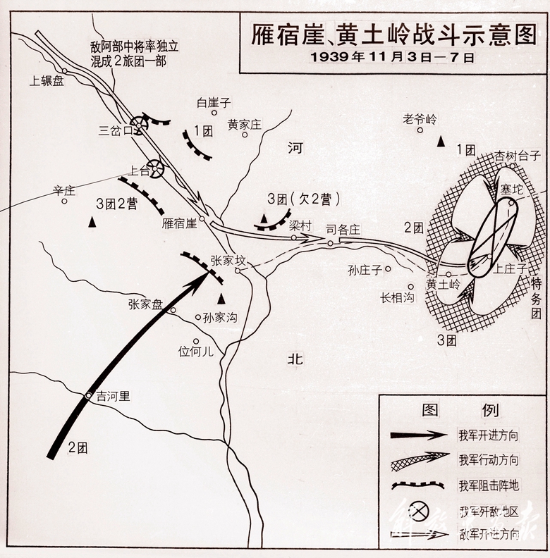 雁宿崖、黃土嶺戰(zhàn)斗示意圖。