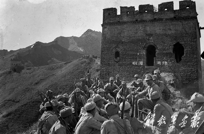 八路軍攻克河北淶源縣日軍據(jù)點(diǎn)東團(tuán)堡后,戰(zhàn)士們?cè)陂L(zhǎng)城烽火臺(tái)上歡呼勝利。
