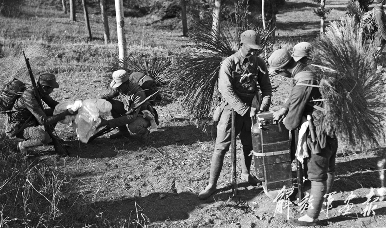 八路軍戰(zhàn)士在搜索中前進(jìn)。