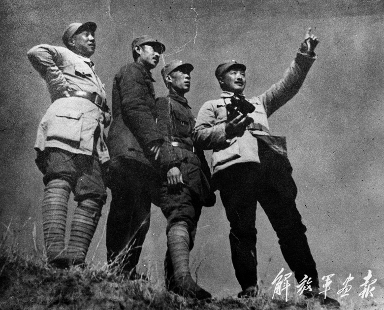1937年10月,雁門關(guān)伏擊戰(zhàn)之前,八路軍第120師領(lǐng)導(dǎo)觀察地形。右起依次為:賀龍、周士第、關(guān)向應(yīng)、甘泗淇。