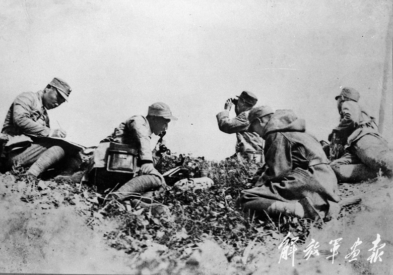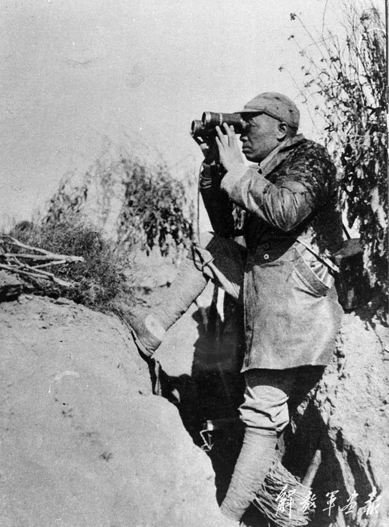 1938年,秋季反圍攻戰(zhàn)役中,晉察冀軍區(qū)司令員聶榮臻(站立者)在前線指揮作戰(zhàn)。