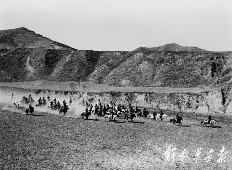 馳騁在晉西北抗日前線的八路軍第120師騎兵部隊(duì)。