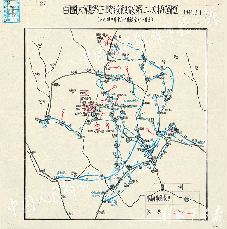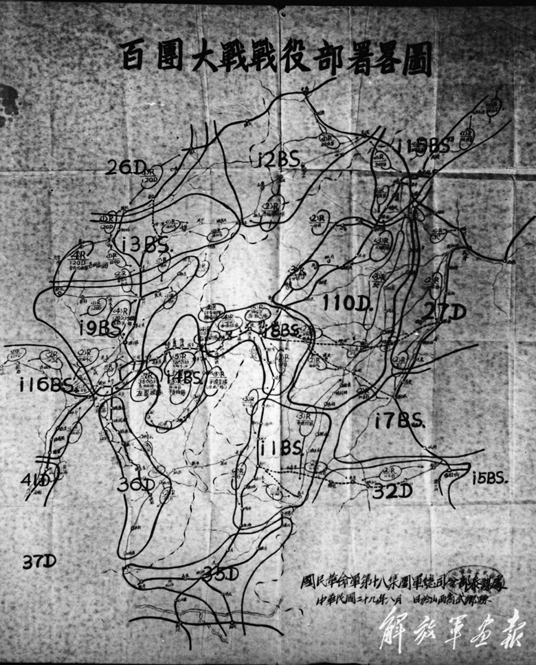 1940年8月,八路軍總部參謀處在山西省武鄉(xiāng)縣繪制的《百團(tuán)大戰(zhàn)戰(zhàn)役部署略圖》。